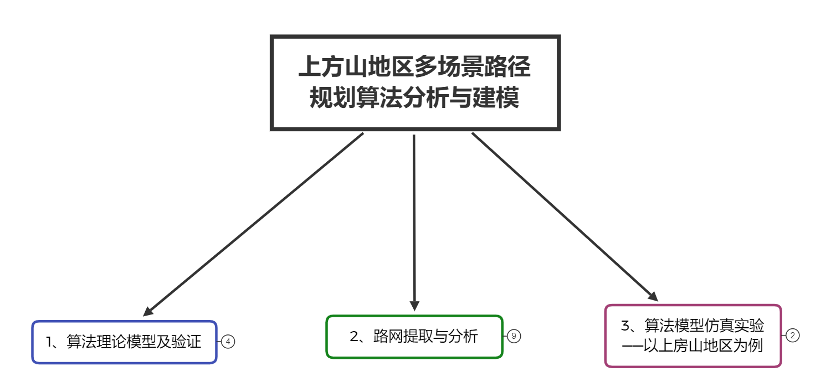 山区是地形复杂且灾害意外多发的地区,且路况也更加复杂。不论是人员还是车辆,在山区行进时都很容易遇到GPS信号不稳定的情况进而无法动态的对路径进行寻优,或者在山区保护与管理的日常事物时,需要提前规划每一位管理员的巡逻路线,以降低管理成本等……因此针对事前进行静态路径规划有着大量的需求。传统的道路选线过分依赖于路径设计专家的经验与知识,难以获得统一的科学决策方案且时效性较差的问题,现代更加常见的是基于路径规划算法结合计算机技术快捷的得到满足实际需求的道路。现有的路径规划算法主要有静态路径规划方法和动态路径寻优。静态路径规划方法与交通网结构密切相关,与实时交通状况无关,常应用于工程规划、地理信息系统、军事、电气网络等领域;动态路径寻优算法与实时交通状况有着密切的关系,根据实时交通,规划出成本最低的路径,涉及领域包括行车路径规划、物流运送、交通旅游等。 上方山地区主要地形为山地,地形起伏大,GPS信号往往并不稳定,缺乏实时交通流数据,针对的是事先路径规划,因此只在静态路径规划方法基础上寻求时间的最短寻优。其内部交通并不发达,多为一侧是山体,另一侧为沟壑的山间小径。在受到时间限制的一些场景如景区管理、救援救灾、物资配送、人群疏散、军事行动等场景下,如路径选择不当都容易在途中耗费更多的时间成本乃至物质成本,因此利用现有发展技术提前选取和规划合理的疏散与救灾路径可以缩短人员的路程及消耗时间、或使群众尽快安全撤离、救灾人员尽快到达受灾区域等等,这对于上方山地区的发展和管理有着十分积极的意义。 研究以整个上方山国家森林公园为研究区域,对基于GIS成本路径的道路规划进行研究。综合考虑了坡度、坡向、高程、起伏度等地形因素,在原有交通网络的基础上提取出了一些潜在的道路丰富了上方山地区的路网,基于Dijkstra最短路径算法和网络流算法与GIS技术相结合的方式建模,对各影响因素指标层进行综合分析,得到最终选线结果,并对该结果进行了可视化展示和分析评价。