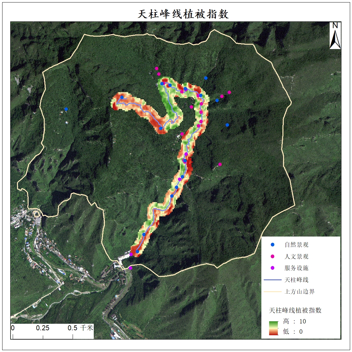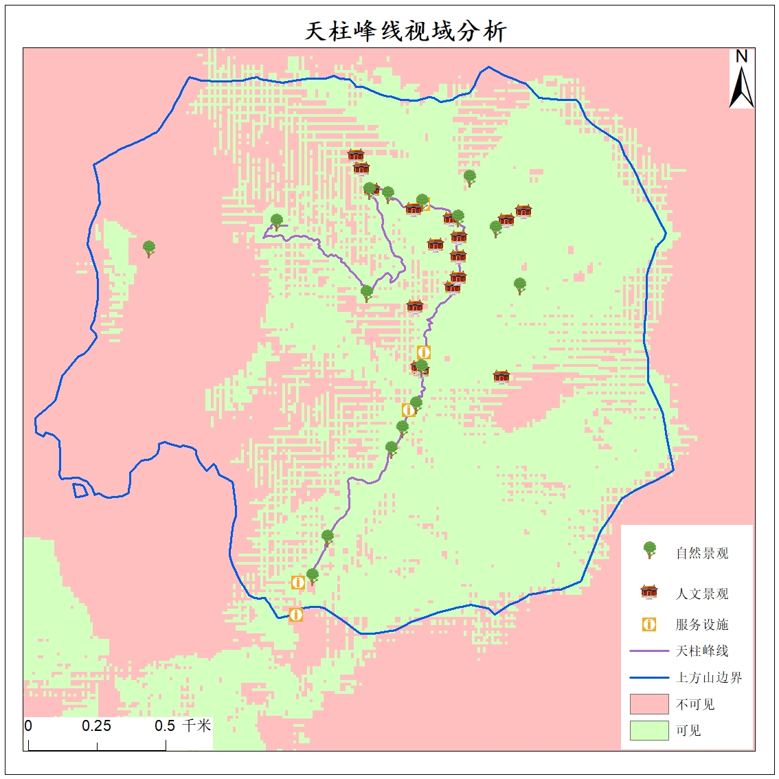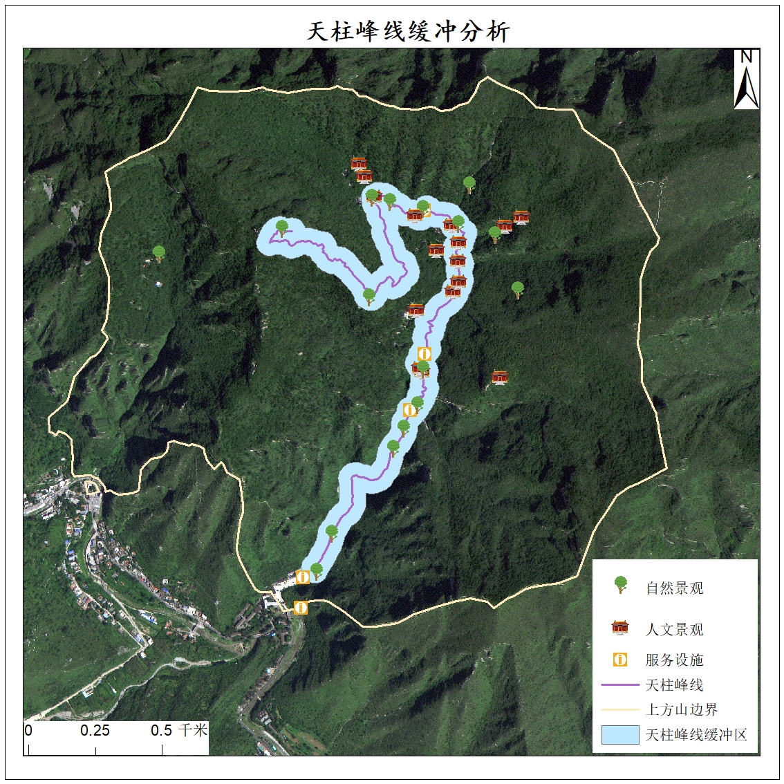该图介绍了此路线50m范围内的地标设施,可用缓冲区内景观以及服务设施数量来作为路线评价的影响因子。该路线在东门到兜率寺一段自然,人文景观较多,从兜率寺到天柱峰一段景观较少。