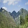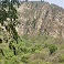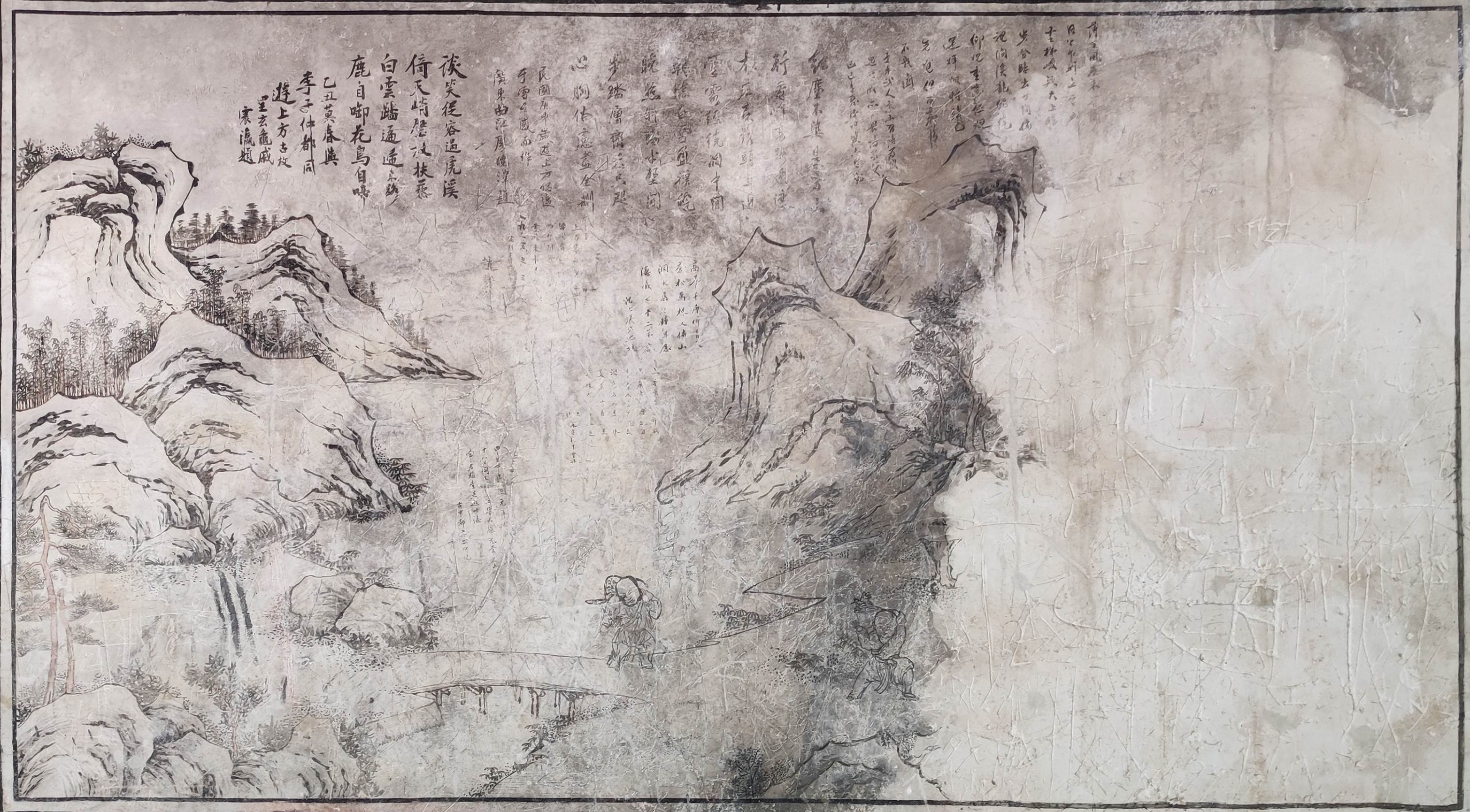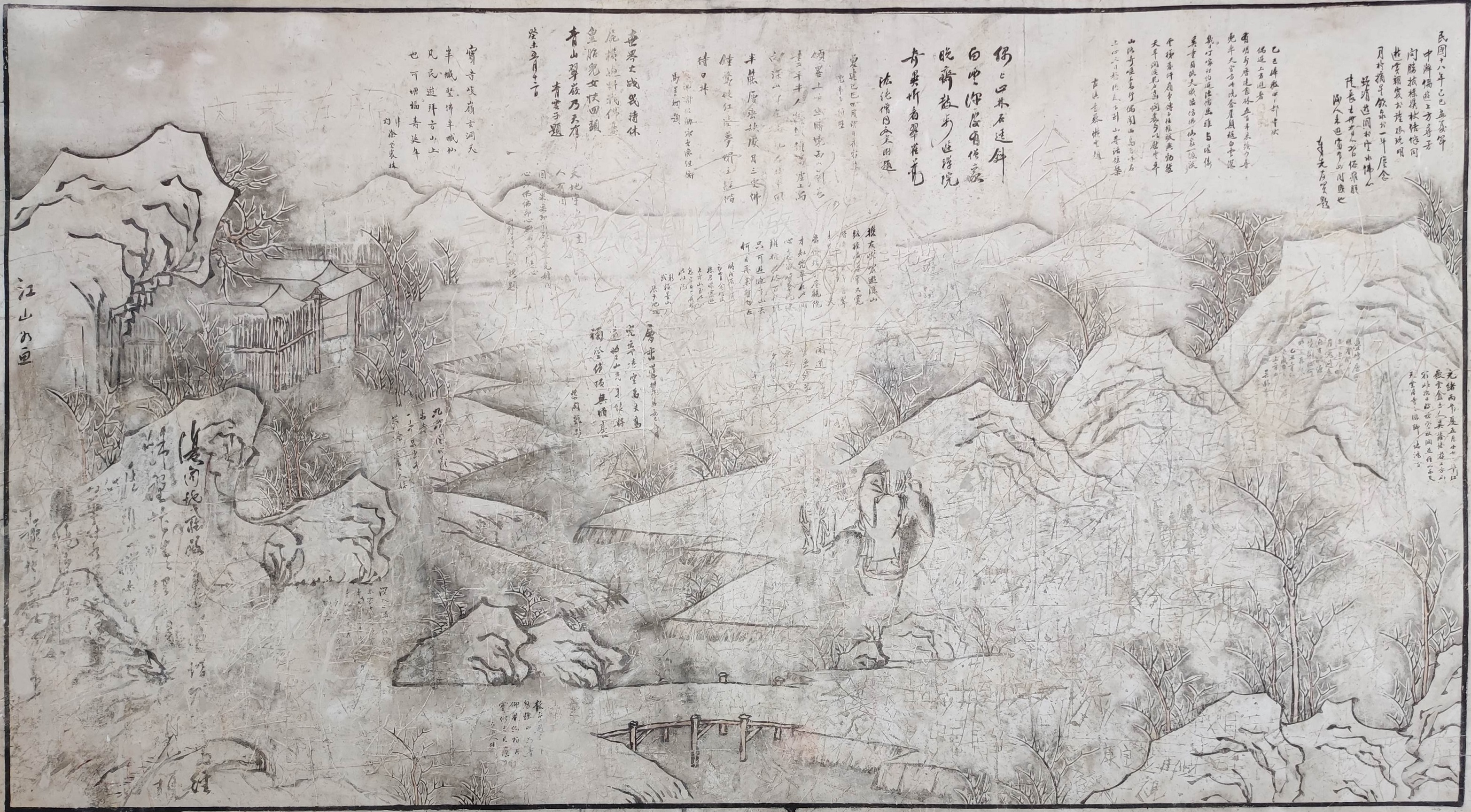左侧峰峦起伏,林树隐于崖际,两三来客乘驴转过山径而来,浅溪东逝于远山,小桥越涧独横,对岸山崖犬错,草舍茅葛静卧崖底。