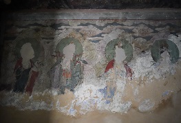 两侧墙壁共有八个佛影像,有观音菩萨,地藏菩萨,善财童子,高僧等。背景为一片云海,此起彼伏,波澜壮阔,泱泱大观。