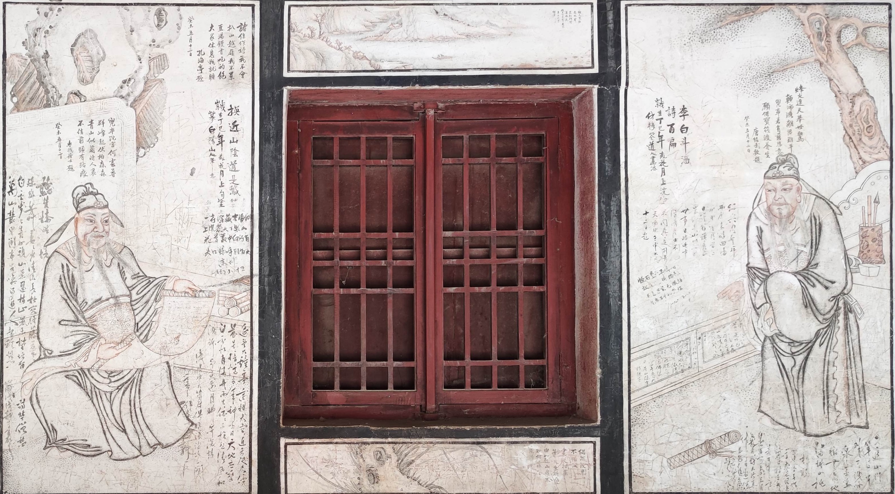窗两侧人物画两幅,窗楣山水一幅,窗底花鸟一幅。
