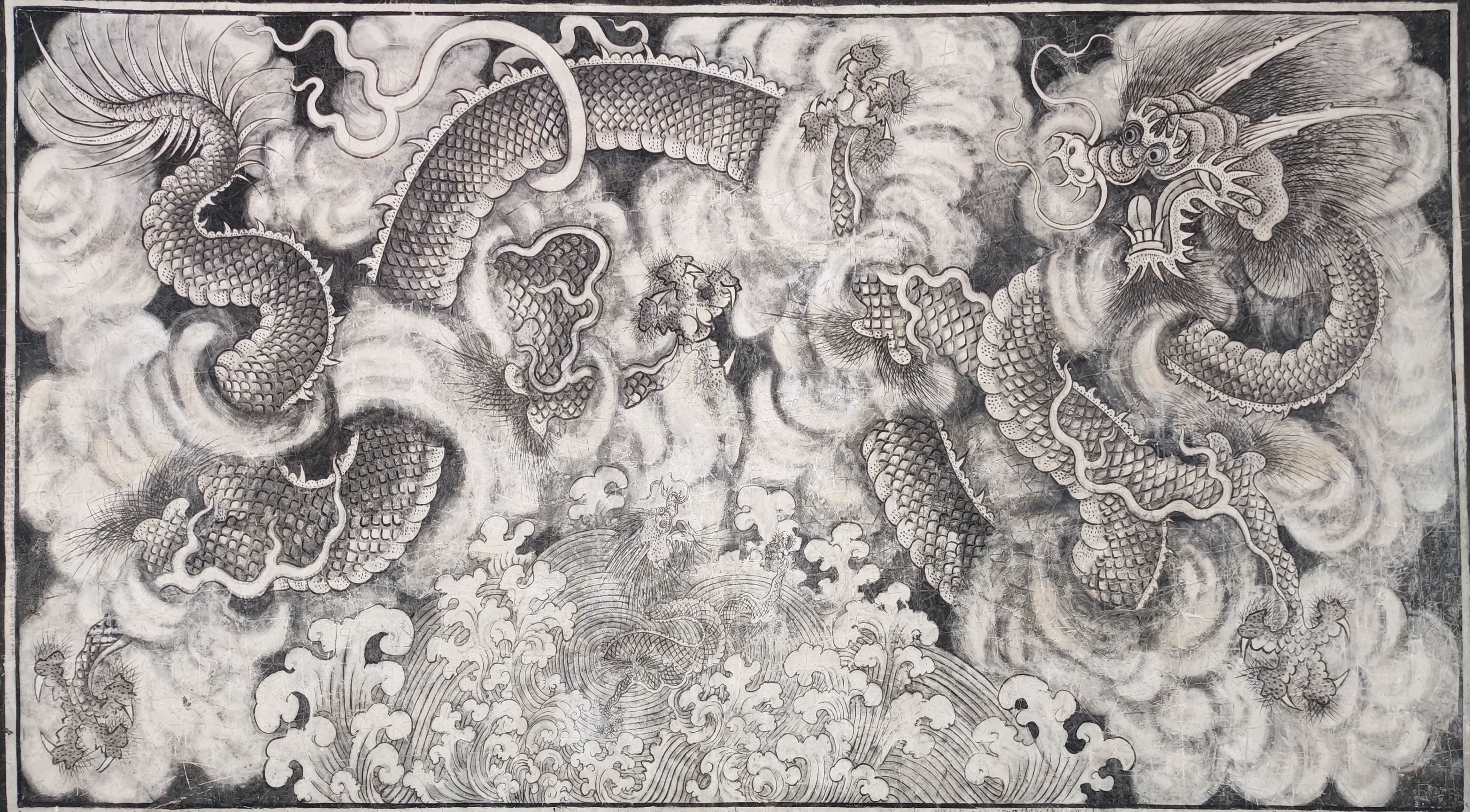 一巨龙翻云覆海,须发森然,巨口大张,双目圆睁,虬髯狂甩。涛澜四起,云雾升腾。一小龙于花中仰头而戏。