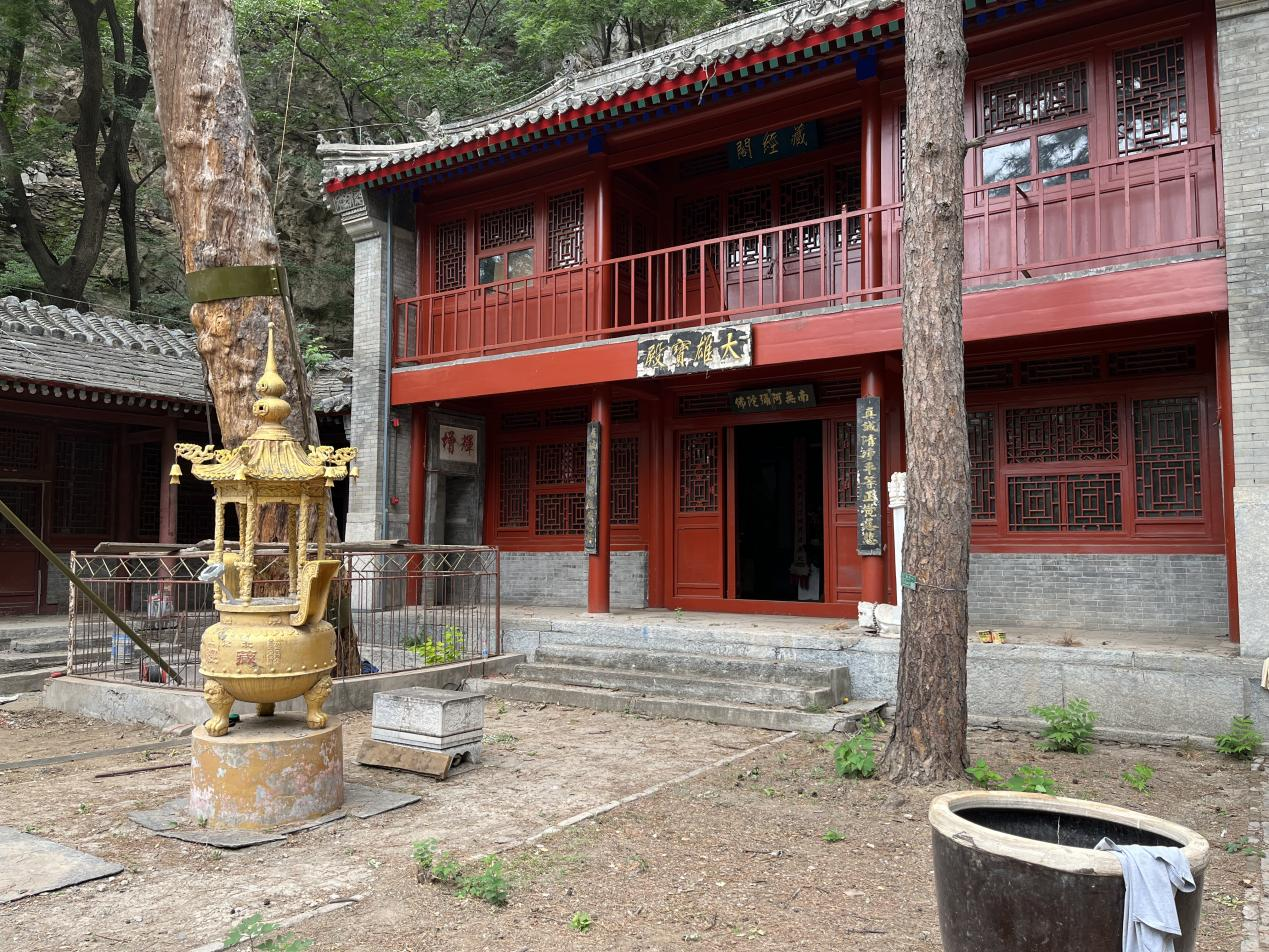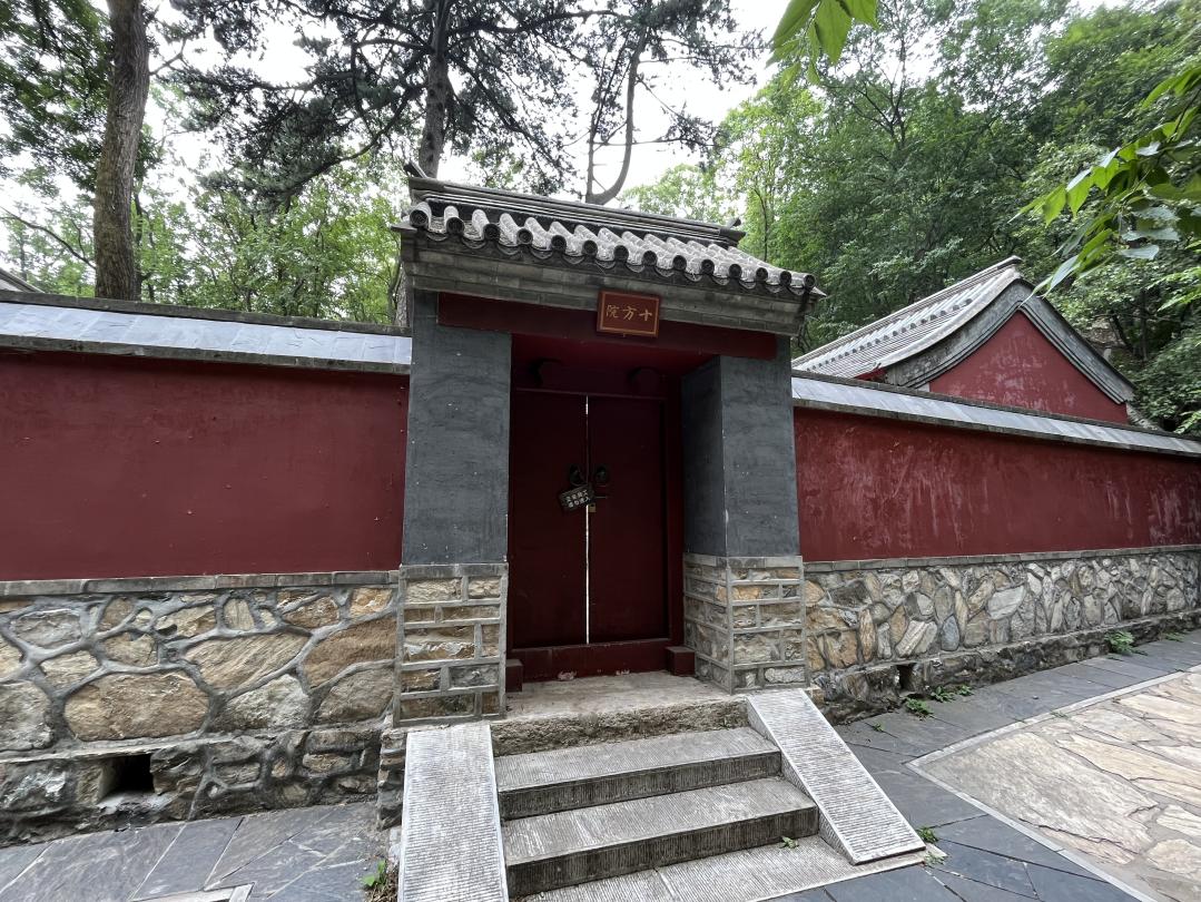 自下佛殿西有小路可达。院背南面北,西涧西来经院前而东,有便桥名“步光桥”跨涧通院。过桥临涧有影壁一道,影壁南为山门。进山门,正殿三间,东西配殿各三间。院内有古松两株。十方院居于幽壑,背倚塔院,覆苍林,面灵溪,仰兜率,佳境独成。十方院内,原有金正隆元年 (1156)度公幢,现存于舍利殿。