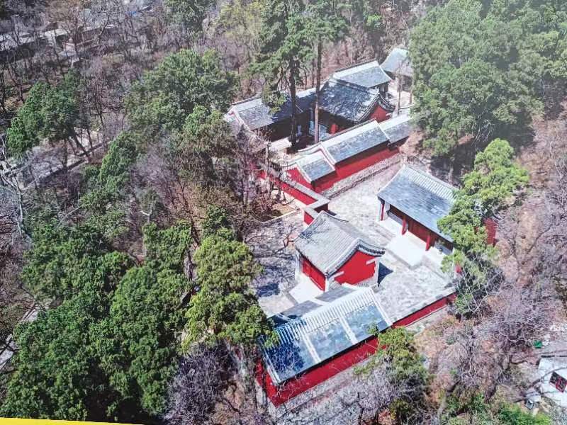 占地五六亩,已圮。背南面北,两进规模。一进正殿三间,东西配殿各三间,正殿前有二明碑;二进正殿三间,背苍岭面青峰,古松成林,绿阴蔽日。