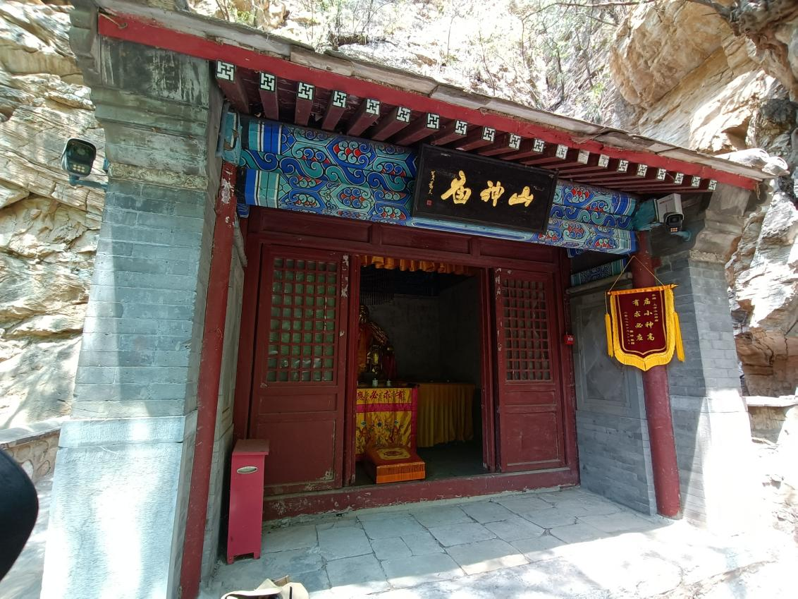 坐西面东,有殿一间内供山神一尊,由青石雕成。山神长绺长髯,披盔挂甲,武将装束,手握一柄开山斧,正襟危坐于宝座之上。
