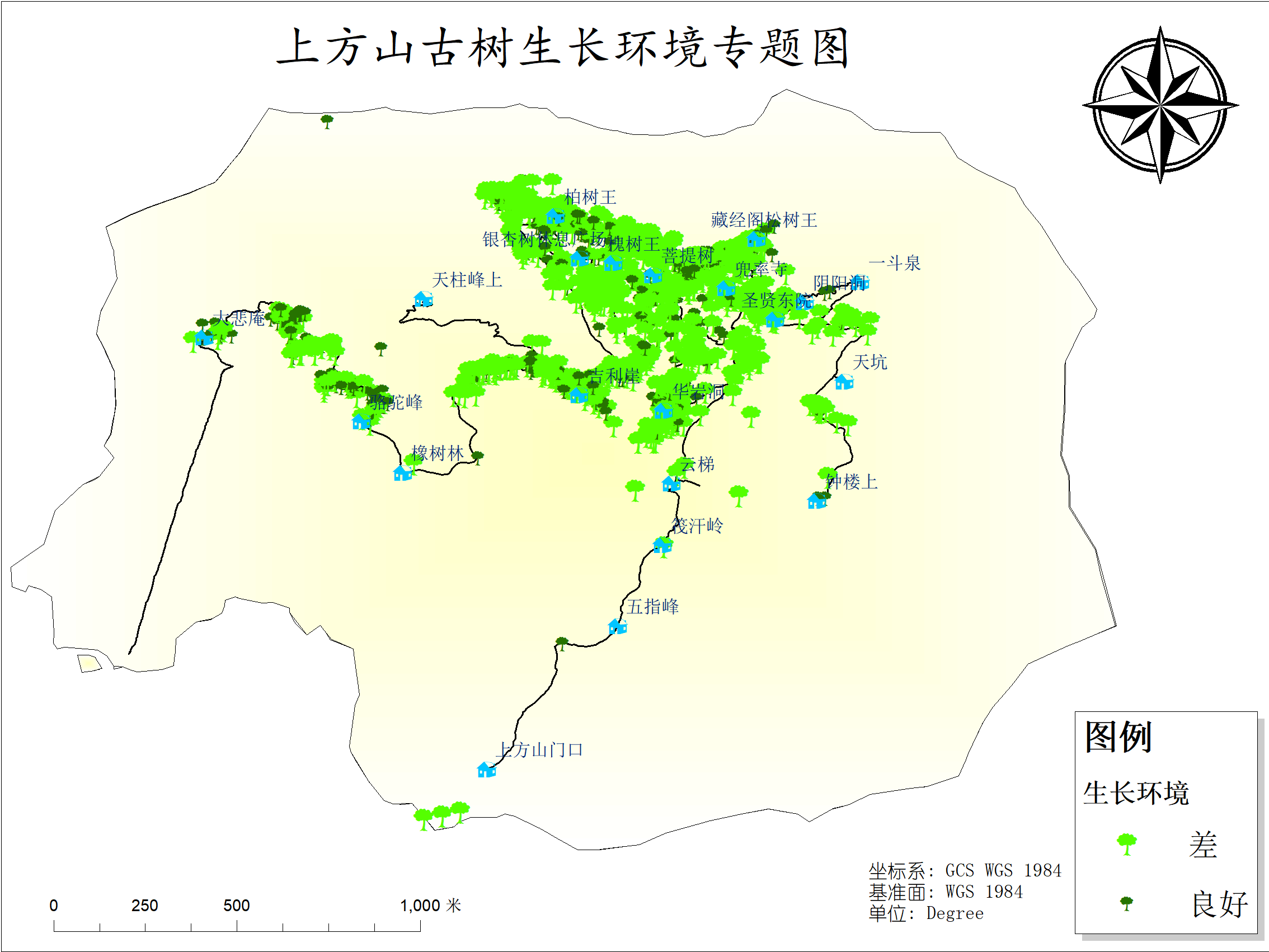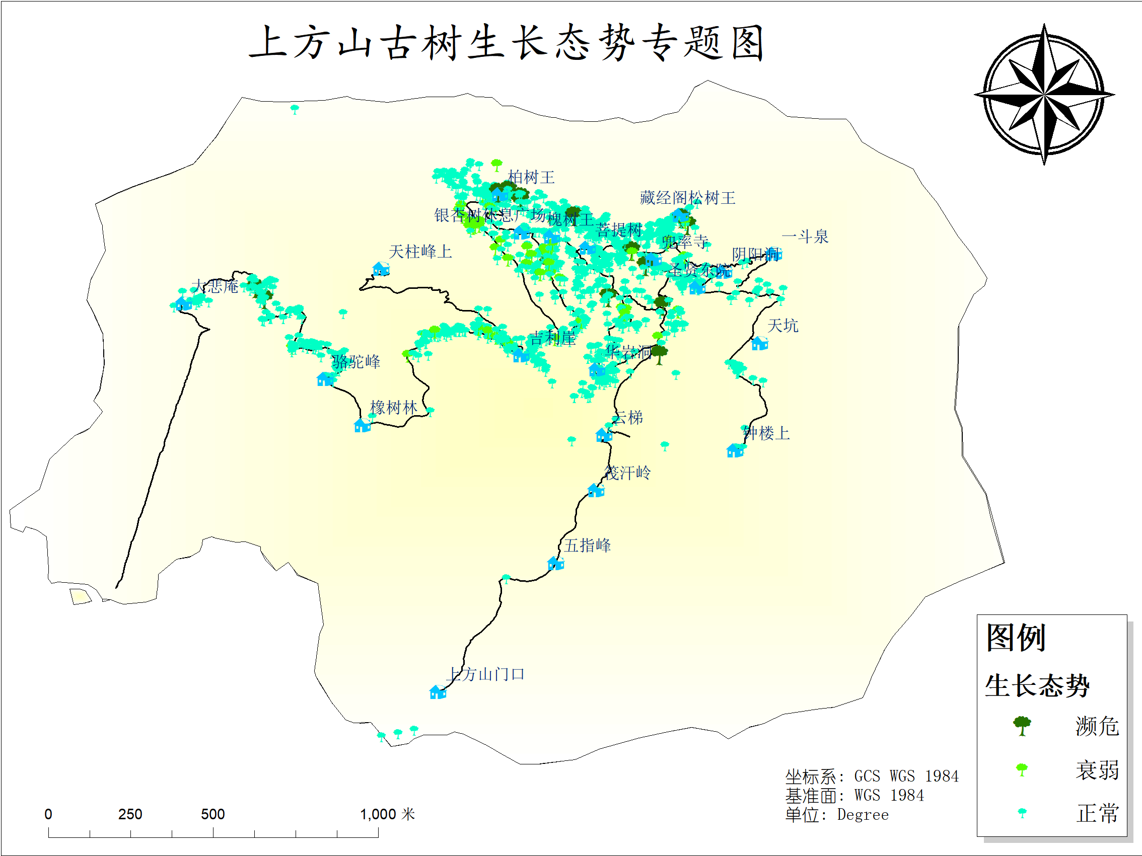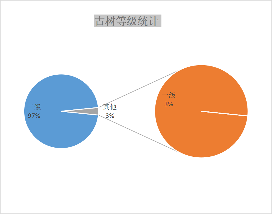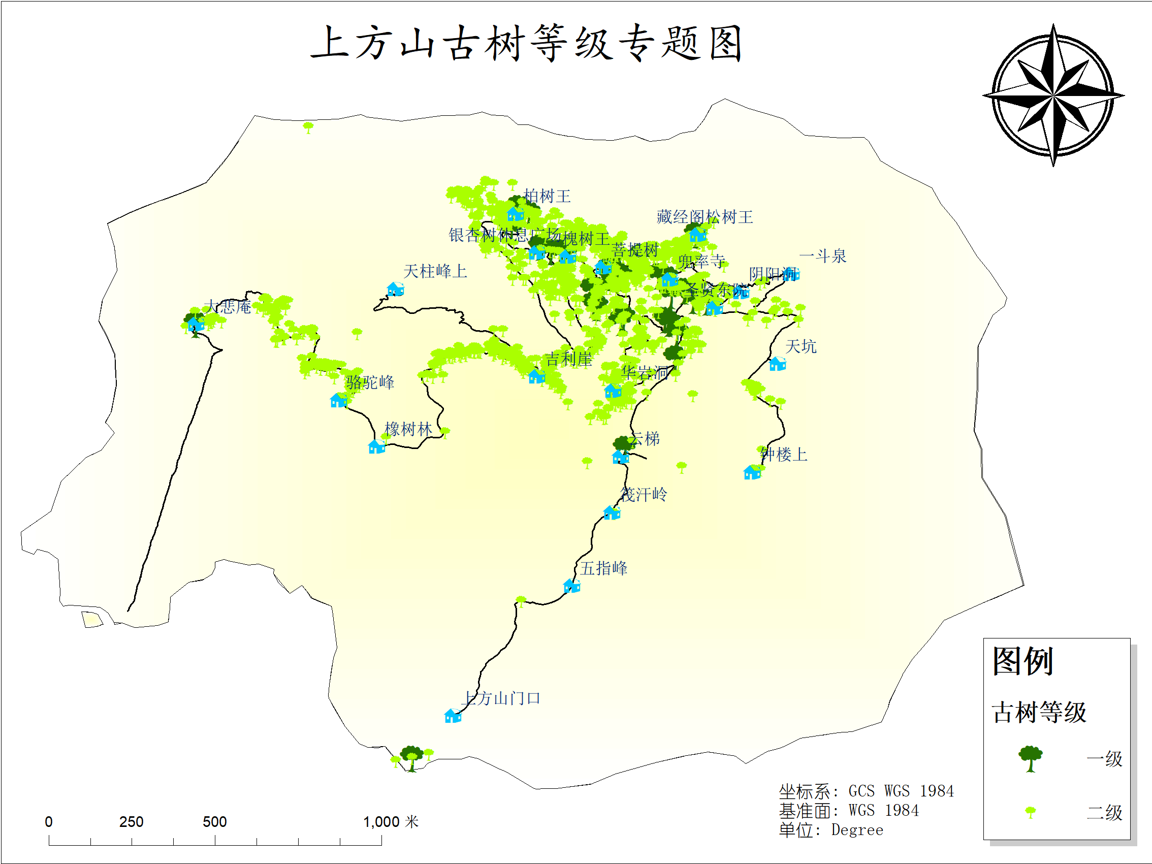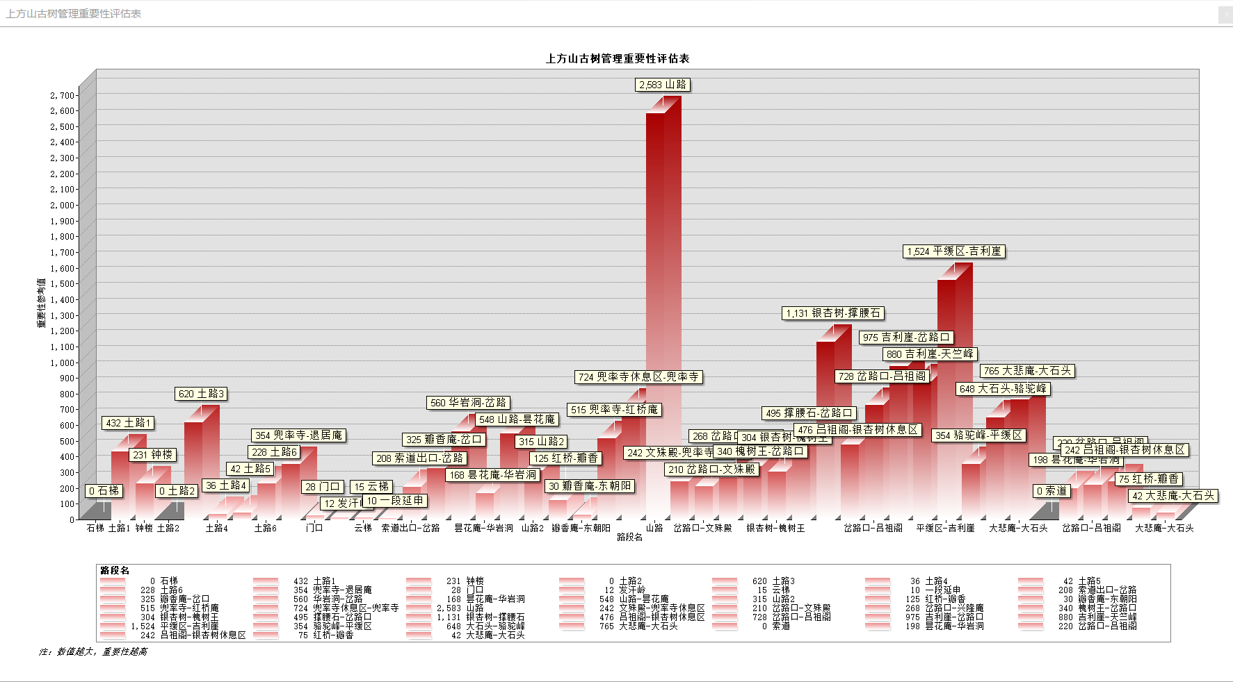 古树名木的价值划分依据其稀有度,历史价值,纪念价值,科研价值等相关因素有着明确的划分,明确上方山古树名木的价值分布等级,有利于在资源,技术人才短缺的情况下合理分配资源,使得古树的价值得到最大程度的保存。