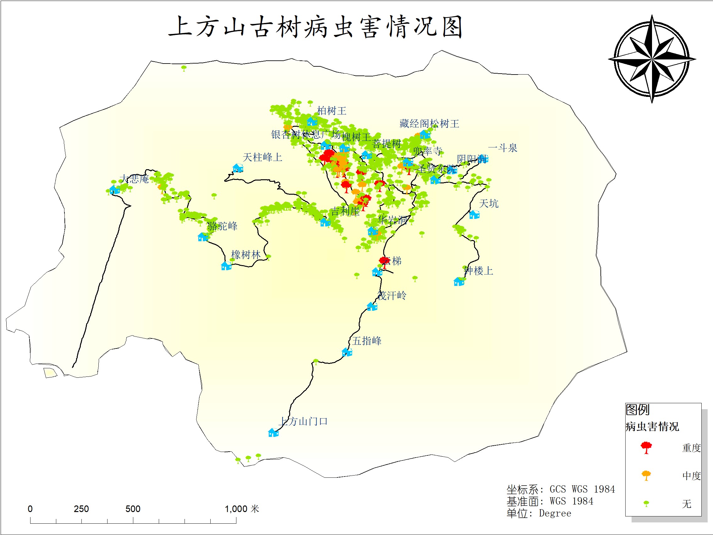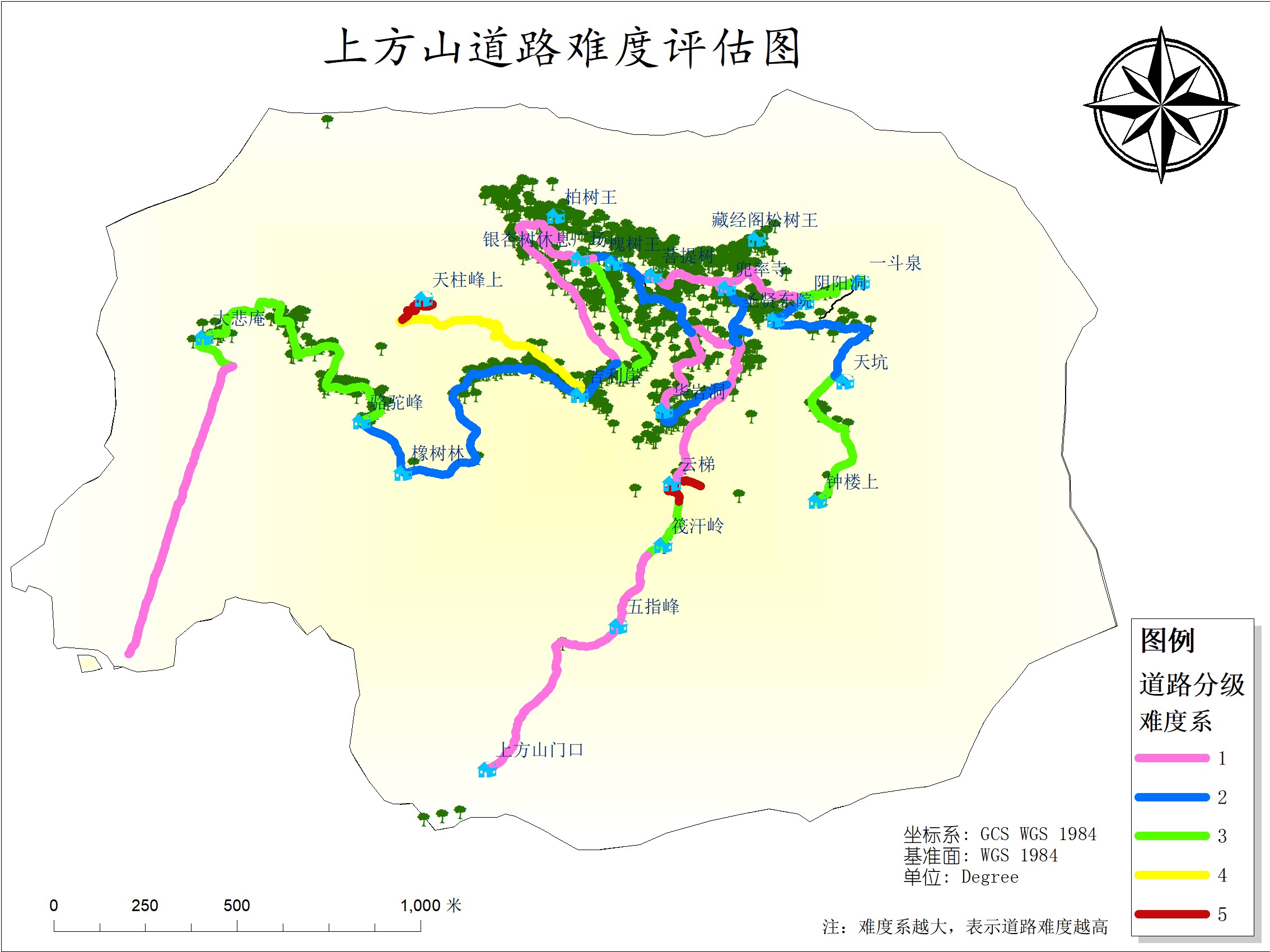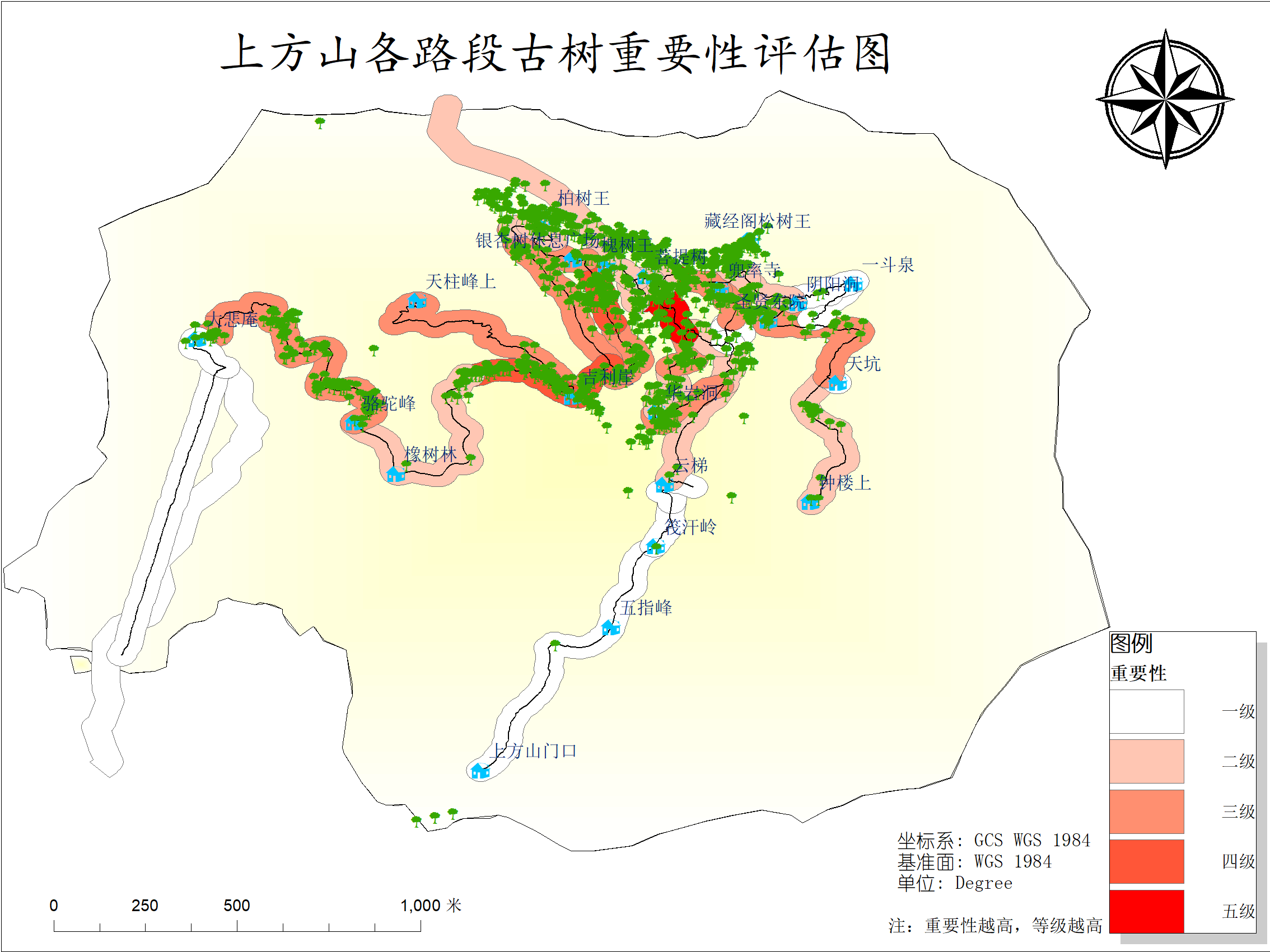 因上方山古树资源充沛,古树保护项目工作量大,进行困难,同时古树保护责任人,资源,技术等古树保护必须要素较少,对上方山古树资源保护项目进行分级化管理就显得尤为重要,根据以上诸要素,我们对古树巡查路径进行分级,根据古树保护重要性合理分配各项资源。