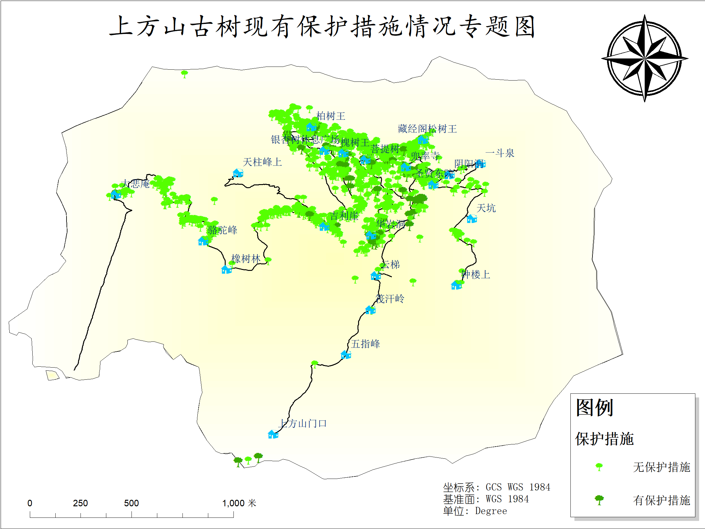 对此,在古树名木保护对策中需加强规划管理,我们在之前上方山古树资源普查的结果基础上,根据古树名木的价值,古树的生长状态,古树的现有保护措施完善程度,古树的生长环境等相关因素的共同作用下建立管理制度,明确各个区域的管理重心,落实管理责任,实现分级养护管理。