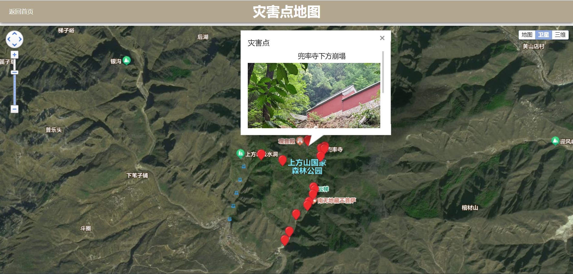 地图上罗列了上方山地区较为明显的灾害点,用户可通过点击具体的灾害点查看灾害点的具体位置和详细照片信息