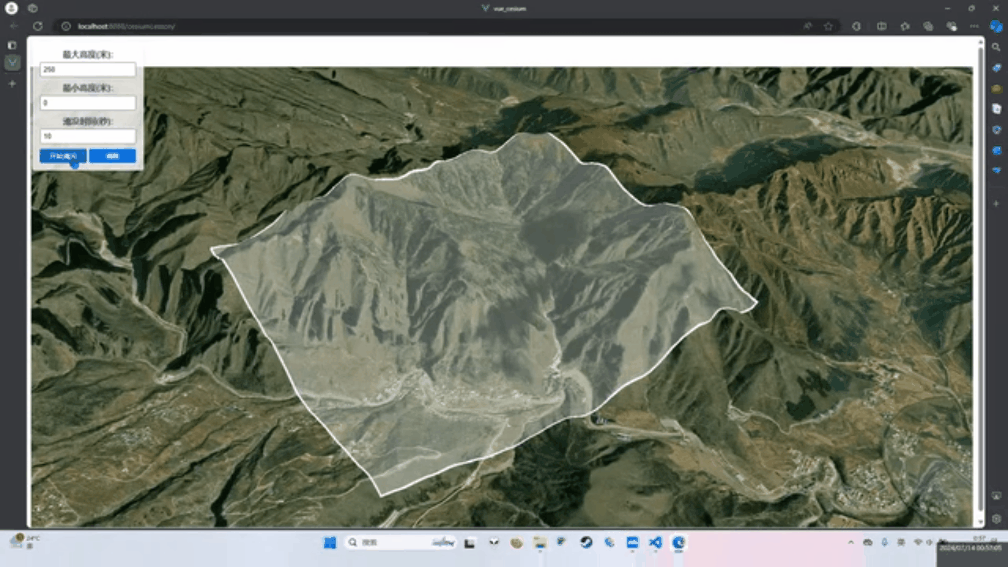 程序模拟了上方山地区受降雨影响后的洪水淹没情况, 用户通过设置最高的水面高度,可以查看对应的淹没情况。 同时用户还可以根据当地海拔更改最低水面高度,修改时间模拟水面上升速度