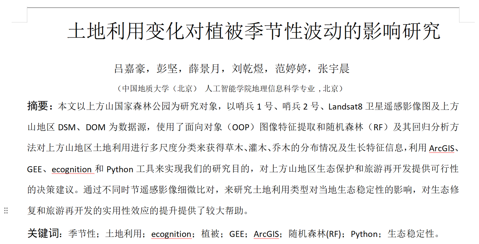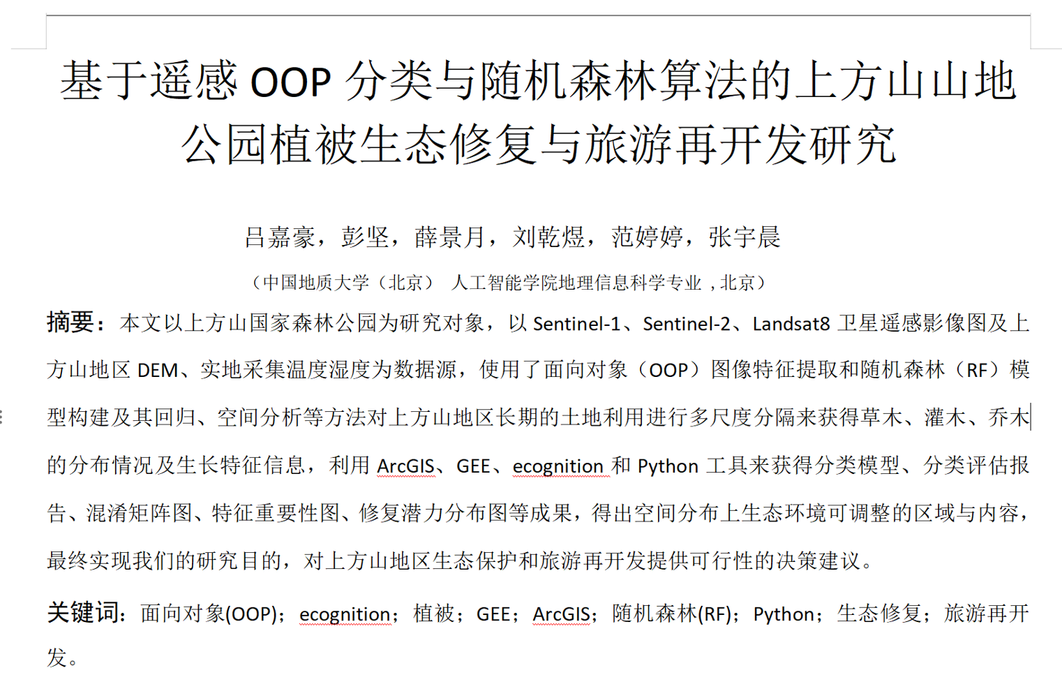 遥感技术(如多波段影像、植被指数)为大范围植被监测提供了高效手段,而面向对象分类(OOP)可通过多尺度分割与特征提取提升植被分类精度;随机森林回归分析则能有效挖掘植被分布与环境因子(如温度、湿度、地形等)的关联,为生态评估提供量化支持。